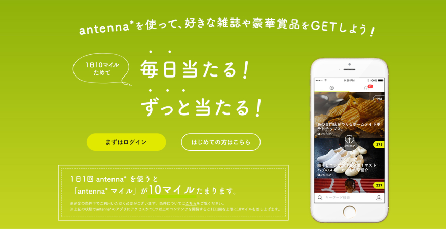 ※ antenna* のアプリにアクセスし、1つ以上コンテンツ(記事)を閲覧すると、1日あたり10マイルが付与されます。