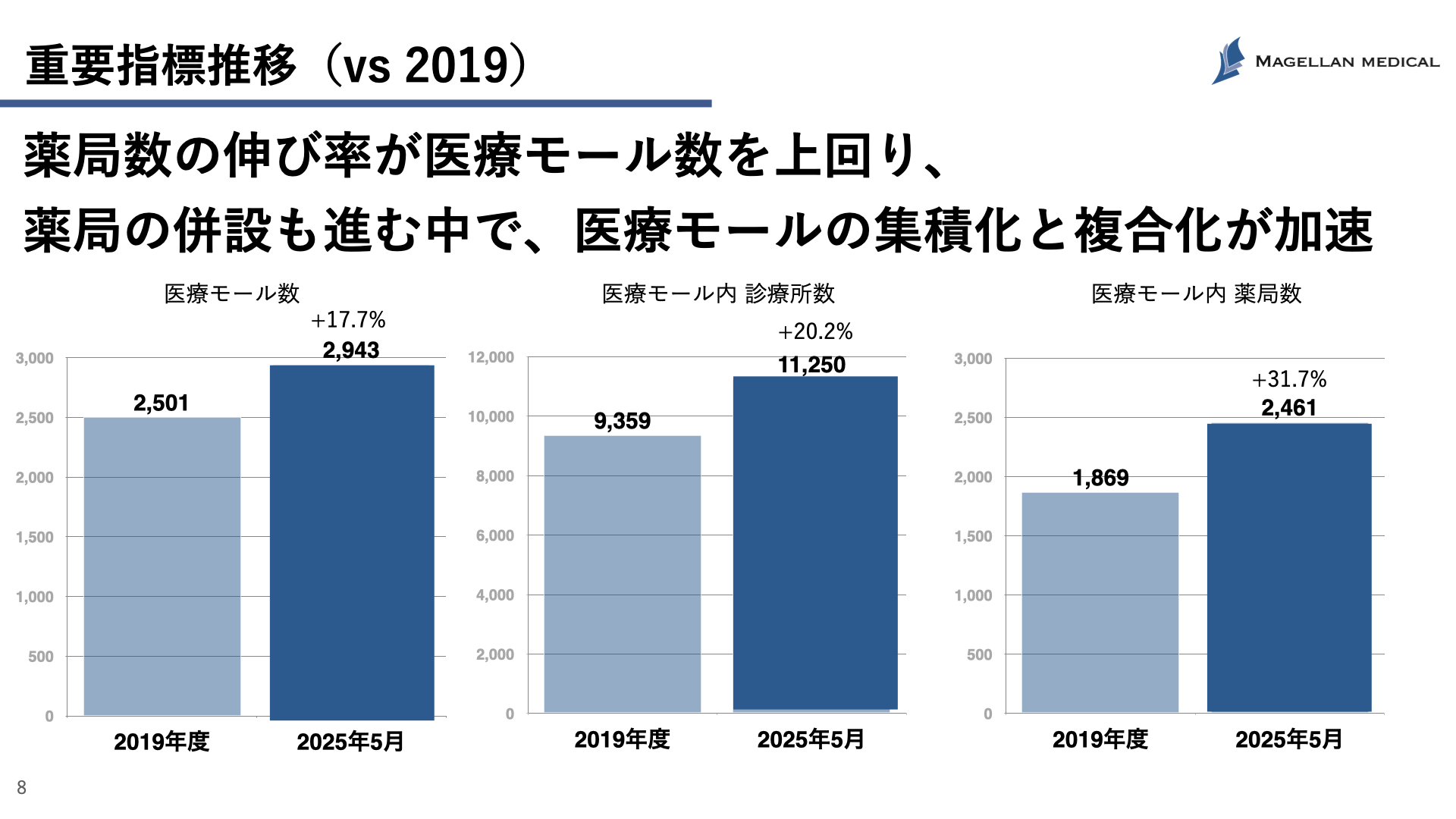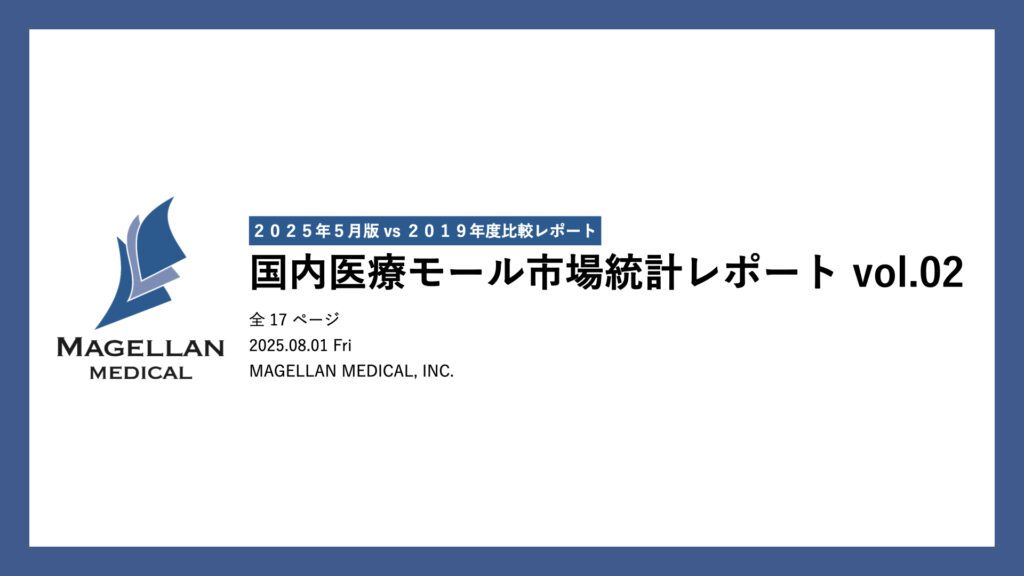 本レポートは、マゼランメディカルが所有するデータベースに基づいて、全国の医療モール数や診療所数・薬局数・立地分布・診療科目構成などを集計し、2019年度から2025年5月までの変化を都道府県別に比較分析したものです。