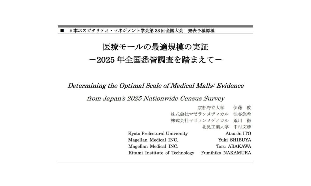 本研究では、マゼランメディカルが実施した全国の医療モール悉皆調査データを活用し、伊藤敦先生(京都府立大学)、中村文彦先生(北見工業大学)とともに日本の医療モールにおける「最適規模」について数理的・実証的に分析し発表を行いました。