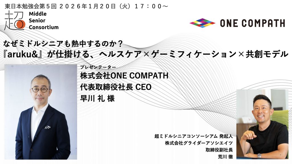 2025年6月6日に発足した、企業の枠組みを超えた共創を目指す共同体「超ミドルシニアコンソーシアム」。5回目となる勉強会を、プレゼンテーターに株式会社ONE COMPATH様をお迎えして2026年1月20日(火)に開催いたします。